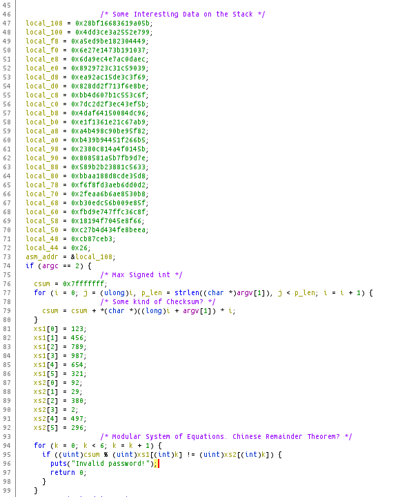 So we have a 64-bit ELF executable with an executable stack. This will come into play later. Next I loaded the binary into Ghidra. In Ghidra we can see some interesting data being loaded on the stack, and some sort of checksum being calculated.
