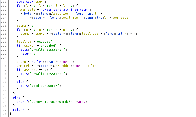 If you needed a space heater, you've got one now! So clearly " ,'nnx~!zlr2}1" isn't the solution to the crackme, but it does pass the checksums. So this means that we can load the binary into GDB and read the decoded shellcode!