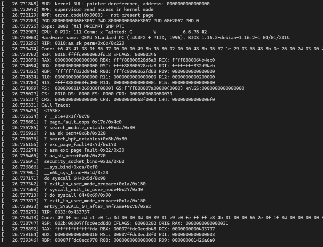 The panic occurs when AppArmor dereferences a NULL sk_security pointer during a bind() call on the recycled socket. This confirms the UAF and highlights the obstacle posed by LSM hooks (see below).